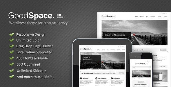 Good Space Good Space is a WordPress theme especially for creative agency. It’s very clean, minimal with modern design. This theme is also has a responsive ability. Moreover, it comes with tons of features. Including our page items that can be managed very easily via our awesome tool, ‘Page Builder’. Admin panel in this theme is a real feature rich. You can also create unlimited sidebar, choosing over 450 fonts or if you want to use your own, we provide a cufon uploader. You can also translate each elements to your language via this admin panel.