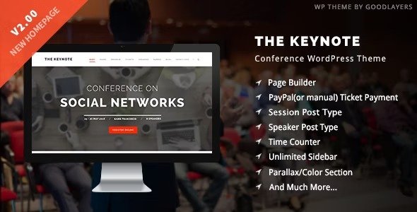 The Keynote is a clean responsive WordPress theme. It?s especially designed for Conference, Meeting, Exhibition, Congresses, Event, Conference Website, Event Management and more. It comes with very important feature for conference and event website such as speaker post type, speaker list, event schedule. Moreover, this theme also has built in PayPal payment system for selling tickets or if you?re using third party agent for managing your ticket, you can also put specific url for each ticket to link to as well.